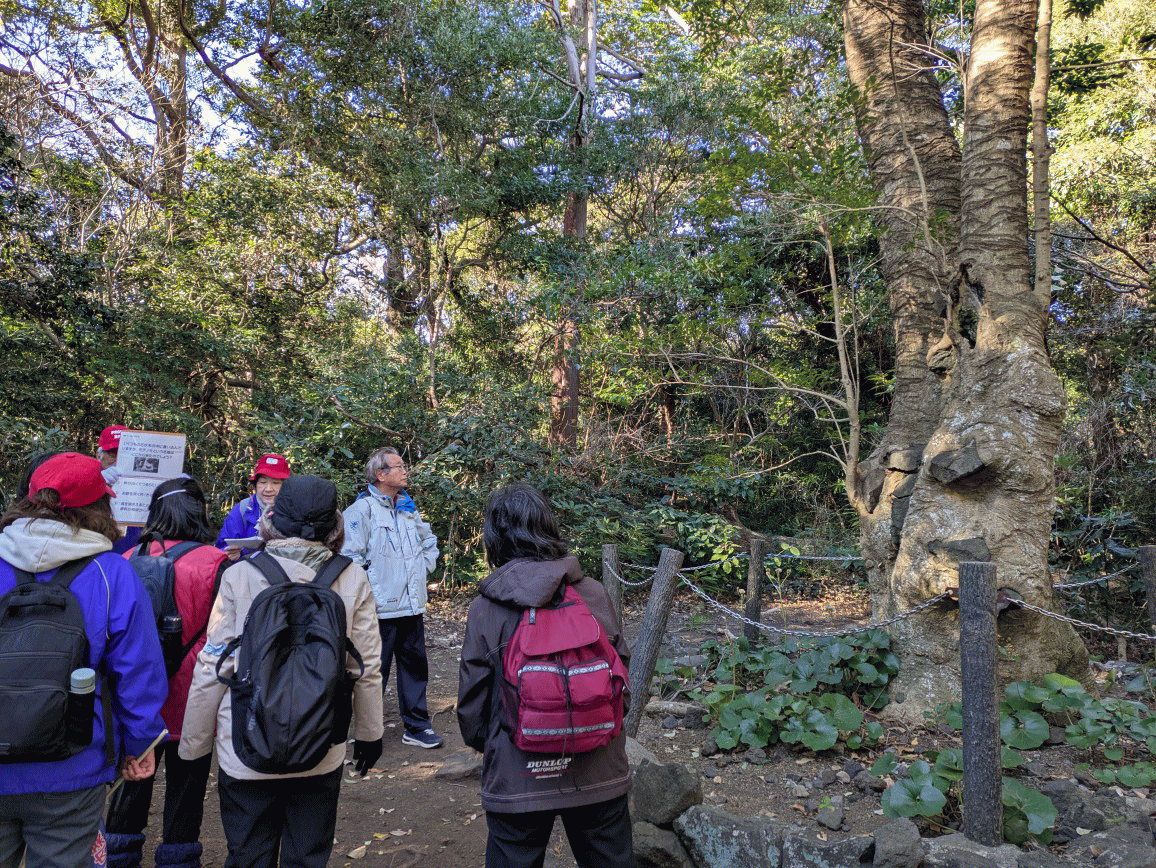 キラキラと光る大海原。落葉深い照葉樹林。縄文の時代より育まれた晩秋の溶岩台地の上を、歴史や謂れ・習わし、動物や植物のクイズを楽しみながら歩くことが出来ました。参加していただいた皆さんには、少しだけ城ケ崎海岸の魅力を感じていただけたのではないでしょうか? ご参加ありがとうございました。